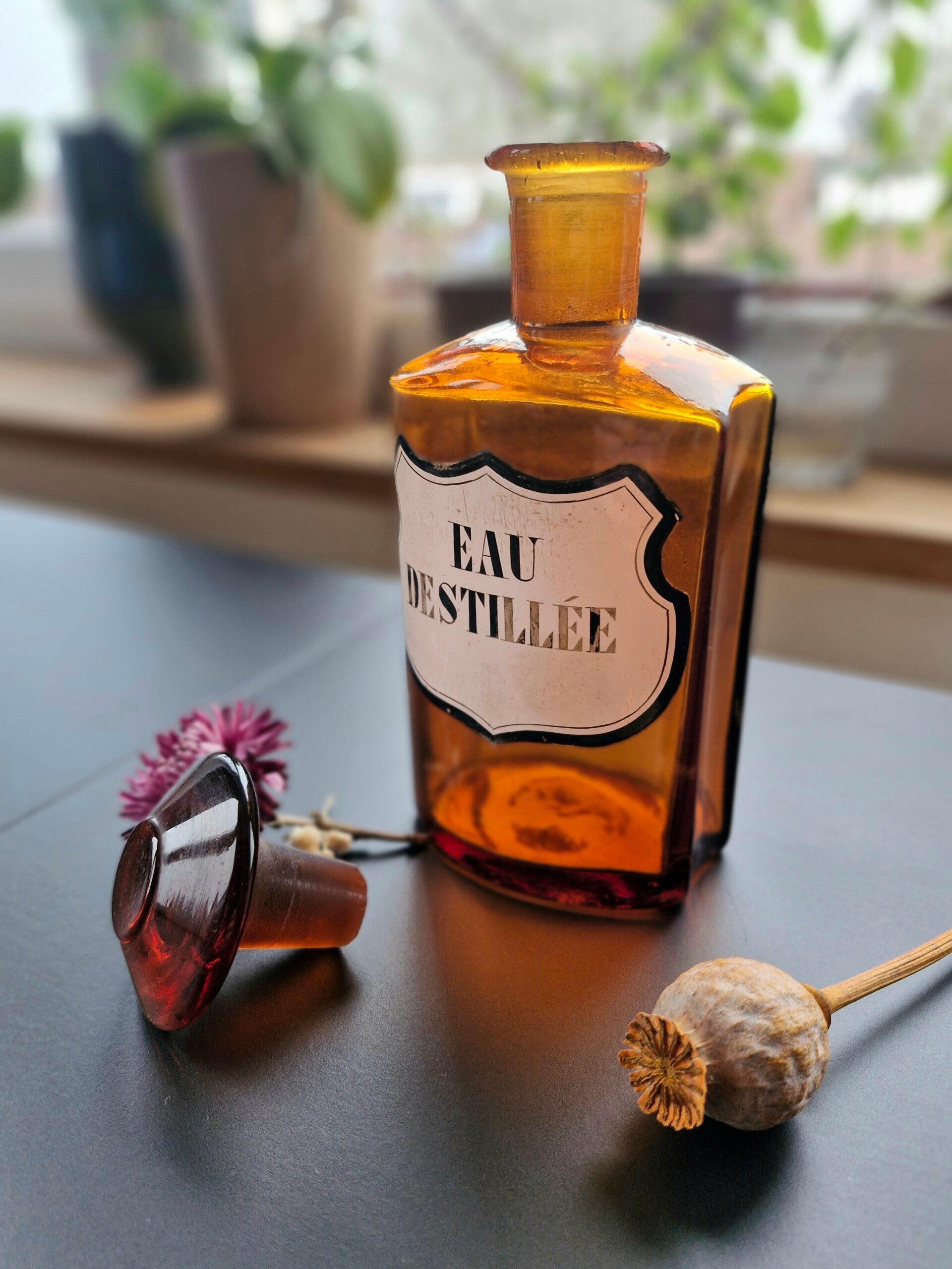 Het etiket, geschreven in het Frans, vermeldt "EAU DESTILLÉE", wat gedestilleerd water betekent.